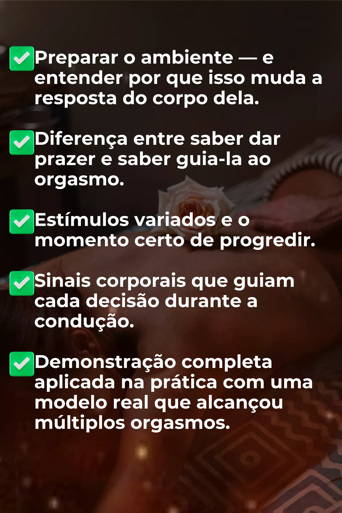 Você aprende o processo completo e acompanha a demonstração acontecendo na prática — com diferentes estímulos sendo aplicados e a modelo respondendo com ápices distintos ao longo da condução